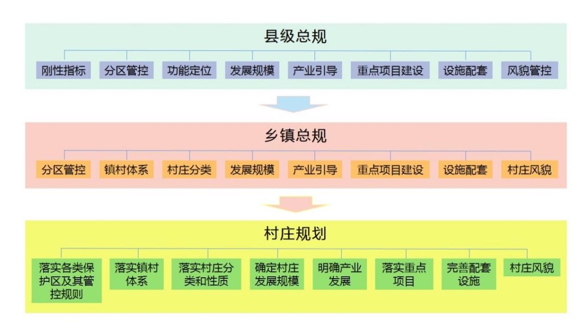 县级国土空间总体规划在刚性指标、分区管控、功能定位、发展规模、产业引导、设施配套、重点项目建设、风貌管控等方面对乡镇、村庄规划进行传导。