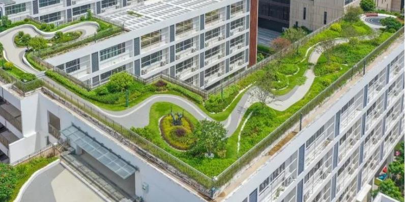 绿色屋顶是指建筑屋顶的部分或全部作为绿化的一种改造景观措施,由植物部分、植物生长基质部分以及屋顶防水结构层一起所组成的一种景观屋顶形式。在雨水控制方面,在建筑屋顶的源头上减少雨水径流总量,削减洪峰流量,增加屋顶雨水停滞时间,降低屋顶雨水径流流速,以及净化屋顶雨水水质。绿色屋顶还可起到屋顶保温隔热的作用,减少建筑制冷制热能源消耗。