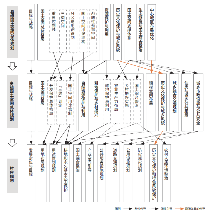 乡村地区国土空间规划的传导方向包括刚性传导、弹性引导及刚弹兼具。从“县—乡镇—村”三级规划传导要素的具体内容以及传导方向来看,三级规划之间衔接紧密,以纵向传导为主。
