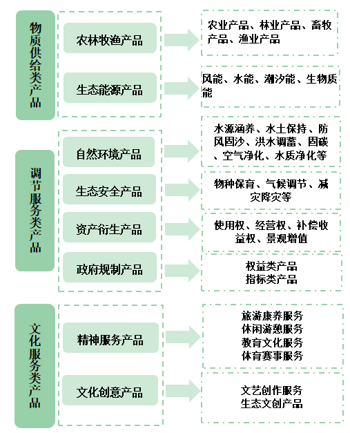物质供给类产品是指生态系统为人类提供的各种有形的物质产品,还可分为直接利用供给生态产品(农林牧渔产品)和转化利用供给生态产品(生态能源产品);调节服务类产品是指生态系统通过其自身的生态过程对环境起到调节作用而产生的无形产品,包括自然生态服务产品、生态安全产品、资产衍生产品和政府规制产品。其中,自然生态服务产品主要包括水源涵养、水土保持、防风固沙、海岸线防护、洪水调蓄、固碳、空气净化、水质净化等;生态安全产品包括物种保育、气候调节、减灾降灾等;资产衍生产品是由生态资源要素所有权衍生出的、具有明确产权的生态产品,政府规制产品是通过政府管控手段创造特定交易需求而形成的权益或指标类生态产品,其中权益类产品主要包括碳排放配额、碳普惠、碳汇产品、排污权、用能权、取水权等,指标类产品包括绿化增量责任指标、森林覆盖率考核指标、森林单位蓄积增量指标、清水增量责任指标、海岸线占补平衡指标、生态积分、水质信用、地票等。文化服务类产品指生态系统为人类提供的具有文化、精神和娱乐价值的产品和服务,主要包括精神服务产品和文化创意产品,其中,精神服务产品包括旅游康养、休闲游憩、教育文化、体育赛事等,文化创意产品包括文艺创作服务和生态文创产品等。