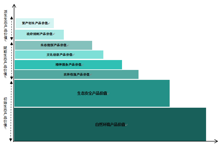 通过分析,本文认为生态产品价值可以理解为初始生态产品价值、赋能生态产品价值、派生生态产品价值,且生态产品价值的构成比例呈现阶梯型分布特征(图3)。初始生态产品价值是指生态系统最基础、最核心的价值,是其他所有价值衍生的源头,主要包括生态安全产品价值、自然环境产品价值;赋能生态产品价值是指在初始生态产品价值基础上,通过适度的人工劳动、技术投入、管理优化或品牌建设等手段,对初始生态产品进行品质提升、功能拓展、效率提高,将其转化为可直接满足人类物质和精神需求的、更具市场交易属性的产品或服务,主要包括农林牧渔产品价值、精神服务产品价值、文化创意产品价值、生态能源产品价值等;派生生态产品价值是指在初始产品和赋能产品价值的基础上,通过制度设计、金融创新以及市场机制所衍生的,代表生态价值产权或政策目标的抽象化、金融化或规制性价值,主要包括资产衍生产品价值、政府规制产品价值等。
