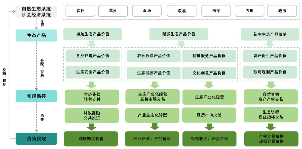 生态产品价值实现的形成机理,是以生态系统的可持续供给为基础,通过差异化路径形成不同类型的价值形态,并借助多元机制贯穿于生产、交换、分配、消费的社会经济循环全过程。最终目标是实现生态保护者受益、使用者付费、破坏者赔偿,促进生态效益、经济效益、社会效益的协调统一。